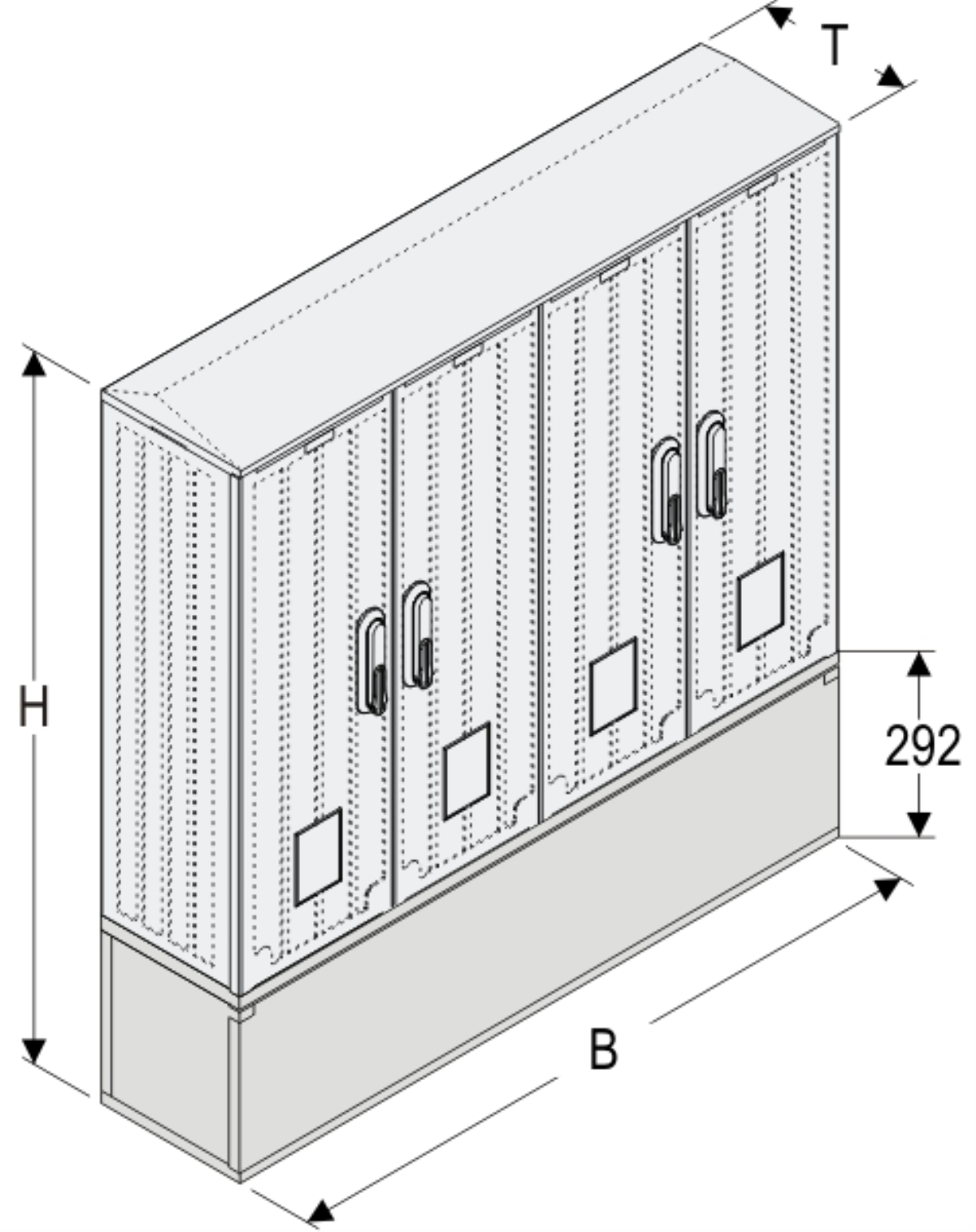 OSZ 26x4x60 + KP Kasten GFK mit Kurzsockel mit Trennwand, gerippt, Schrägdach, 4-türig, 4 Sperren, BxHxT=1058x909x245