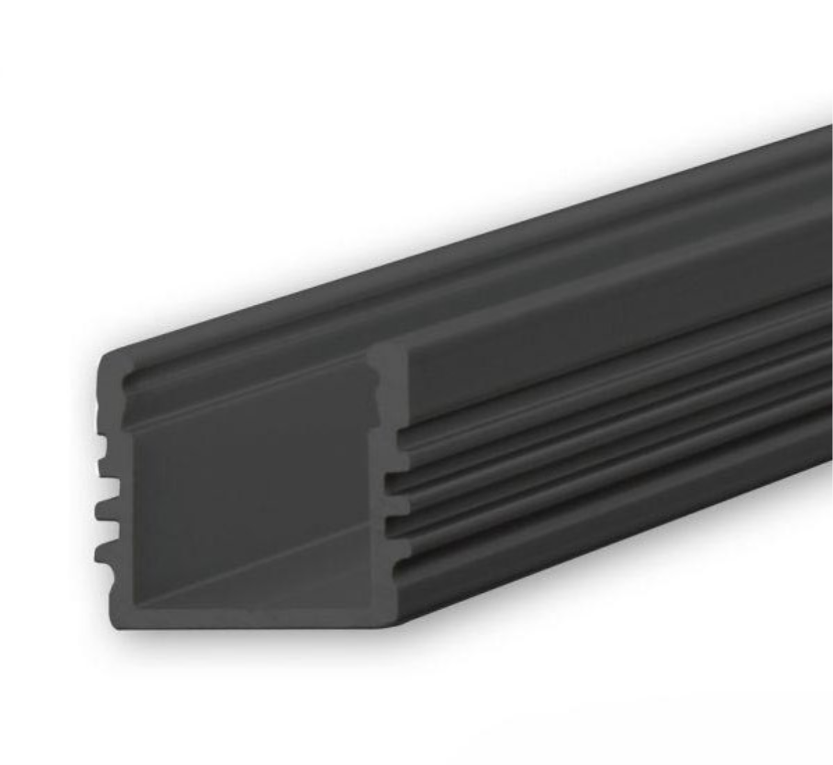 Klasse1 Aluprofil hoch schwarz RAL9005 für LED-Flex; Außenmaß BxH: 16,8x13,01mm; Innenmaß BxH: 12,4x13mm; (für LED Bänder mit max. 12mm Breite) in Stange zu 2m