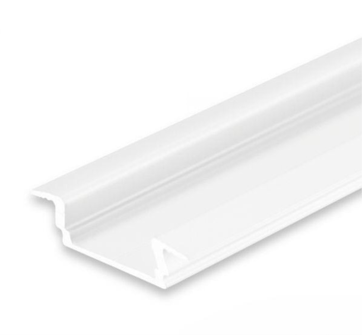 PL8 weiß / Klasse1 Einbau Aluprofil flach weiß RAL9010 für LED-Flex; Außenmaß inkl. Flügel BxH: 23,07x5,91mm; Einbaumaß BxH: 16,8x4,8mm; Innenmaß BxH: 12,4x5,11mm; (für LED Bänder mit max. 12mm Breite) in Stange zu 2m